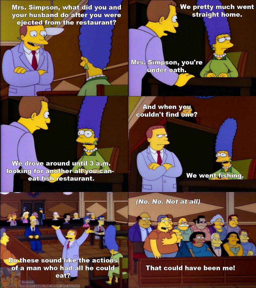 When I was 17 my mom wanted to go to Olive Garden for an All-You-Can-Eat special. I asked her, “What are they going to think when they see ME?” I am a person of inherited gigantism, and at the time was 7’4" and weighed a little over 300 pounds, and (of course) had a voracious appetite. Mom said it doesn’t matter what they think, I’m a customer like anyone else, and to just go ahead and ask for a couple extra plates/servings. I don’t know if management was worried that I’d eat them out of spaghetti. I stopped after four plates, but only because I didn’t want to press my luck.