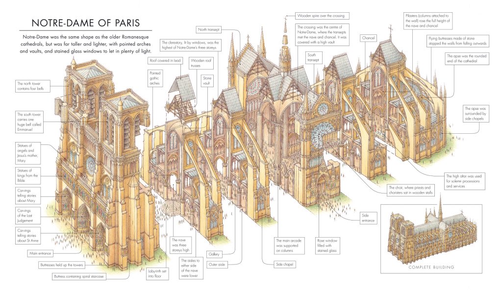 Someone was kind enough to post this to twitter: an ‘exploded’ view of Notre Dame showing the roof space well above the vault. It pretty much matches what the drone saw.
