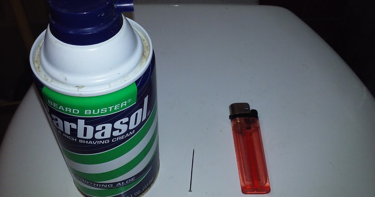 I’m not sure what the shaving creme/sewing needle/lighter combination is supposed to allude to.