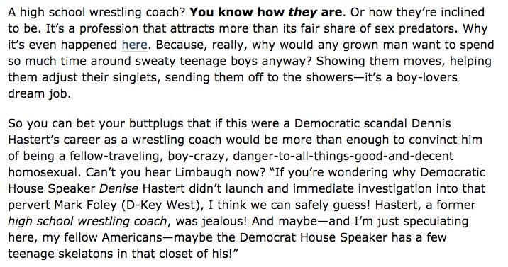 Fox News will have Krauthammer on complaining that the FBI is persecuting Hastert when he was the “victim” of an extortion plot. They will scrupulously avoid talking about what the extortion was covering up, even to the point of saying they won’t repeat the allegations of an extortionist. That will last about three days, and when they are finally forced to acknowledge what Hastert did, they’ll blame it on “a culture of permissiveness.”