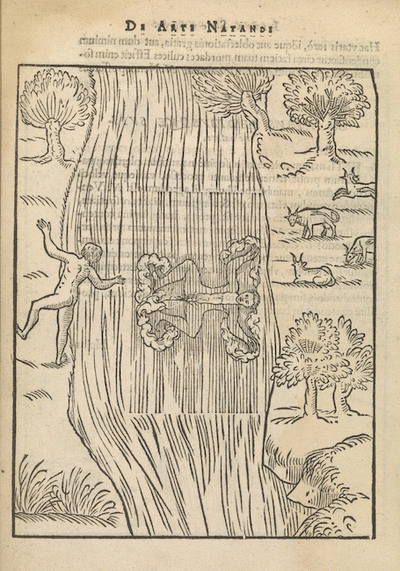That old-time copy-paste technique is funny. Make a woodcut with a blank rectangle in the middle. Then use the frame of the illustration over and over by printing a second, smaller, changing woodcut to the blank area after you’ve already printed a bunch of identical frame pages. Of course, it’s kind of tough to get the cross-hatching lines to match up…