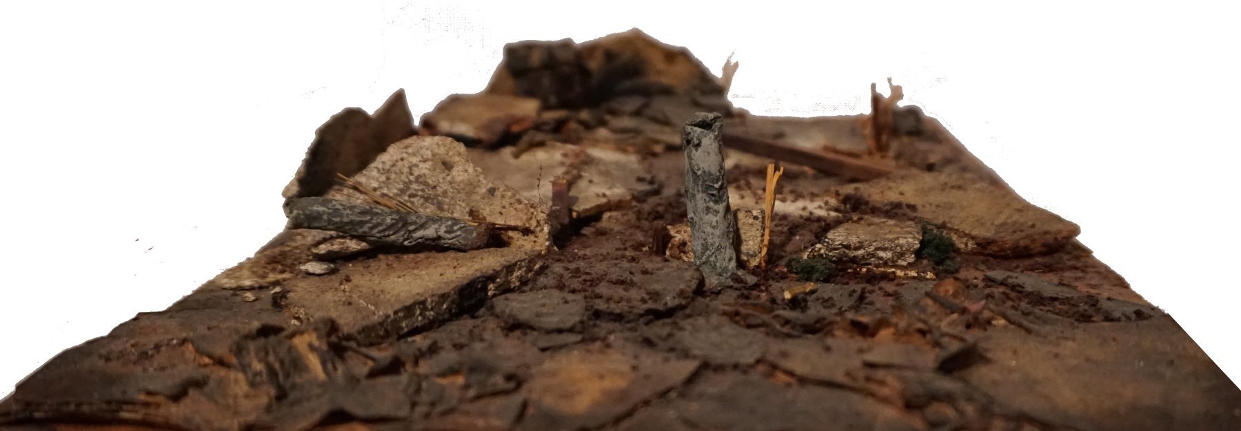 Small diorama (originally made for Warhammer gaming) on 3x6" cardboard. Papier-mâché & found materials.