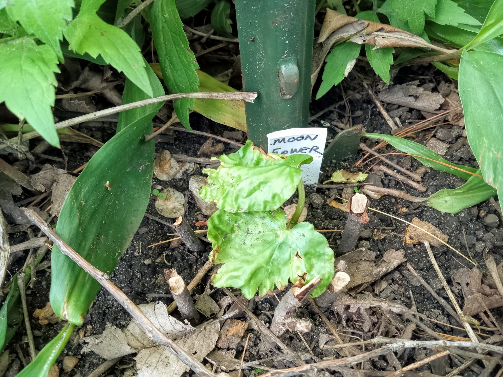 There were seven moonflower seeds in the packet. All sprouted, but only three survived. One I accidentally broke off while transplanting. The other three just didn’t survive. Possibly too much water—it was very dry weather when I transplanted them, so I watered them generously for a few days, and then we got days of big storms and all-day, drenching, pooling rain. Also, I’ve since read that they don’t like to be transplanted.