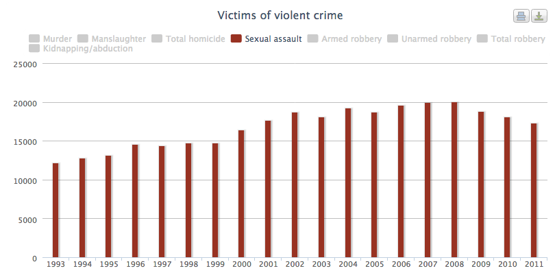 In every category of âviolent crimeâ the trend is undeniably downwards, except for sexual assaults which have increased (which could be a result of increased reporting) and kidnapping which has, despite a generally downwards trend, remained fairly constant.