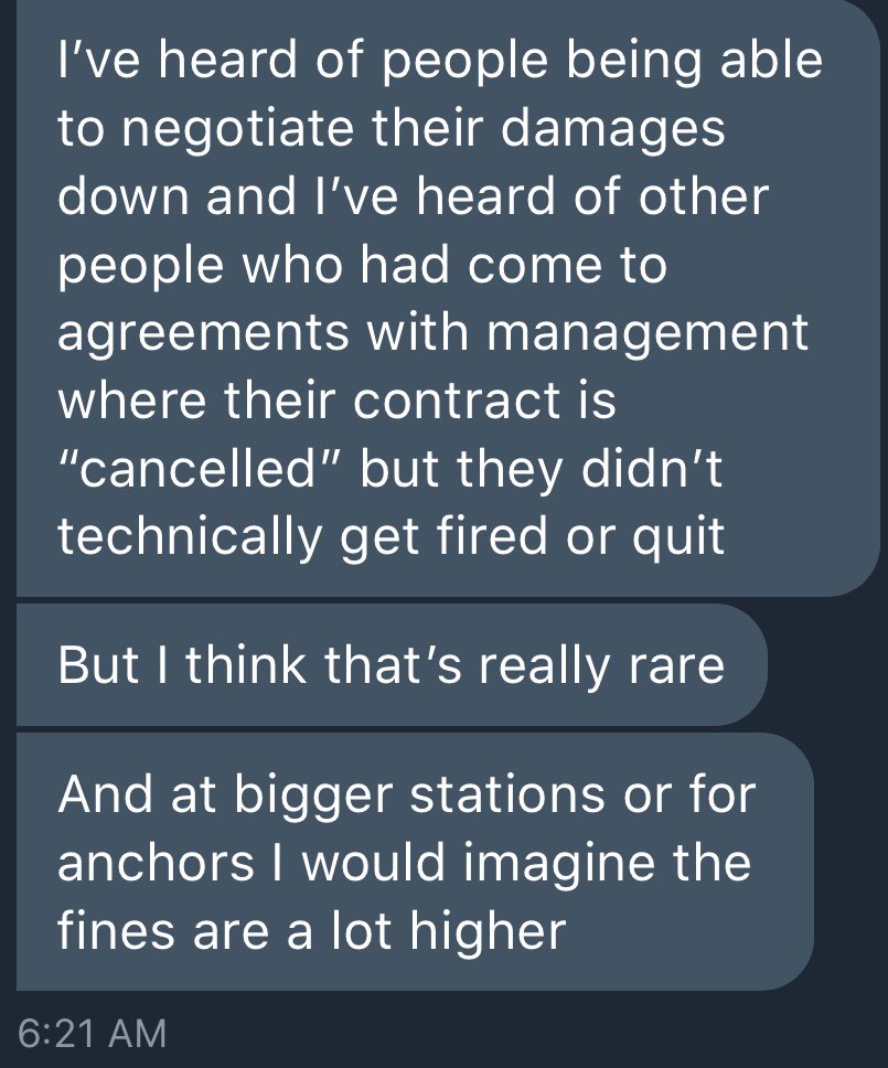 Read through the contract clauses shown. It’s not just the lost paycheque, it’s having to pay not-yet-earned money back, when you no longer have a paycheque. Mortgages don’t go away for newsreaders any more than for anybody else. Children still need food and clothes. Emergency funds (if you can afford to build one) are usually only meant to cover temporary lost income, not massive penalties on top of that.
